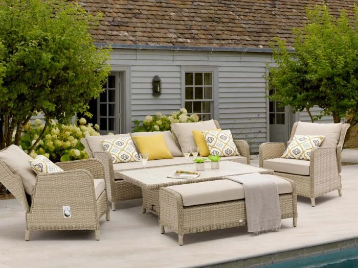 The Somerford collection from Bramblecrest features a traditional design with sumptuous frame with a sandstone rattan finish and thick season-proof cushions included with all sets. Built with aluminium frames and recycled materials the Somerford collection is designed to be robust and long lasting.