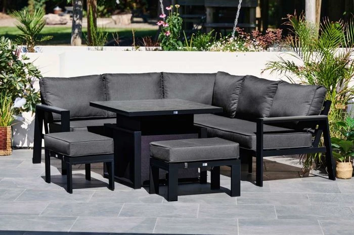 The supportive back bars gives the Livorno chair a powerful characteristic and with the large plump back cushions, the comfort is unforgettable. The thick Polywood armrests fit in nicely with the powder-coated frames creating an extra depth to the Livorno’s overall style. This luxury range consists of a compact corner sofa with two seats either side of the corner unit, two additional footstools and an adjustable pump action table. The summer-proof cushions in the Livorno range provide optimal comfort. All cushion covers are zipped for easy cleaning and the fabric is designed to resist damp and to assist drying.